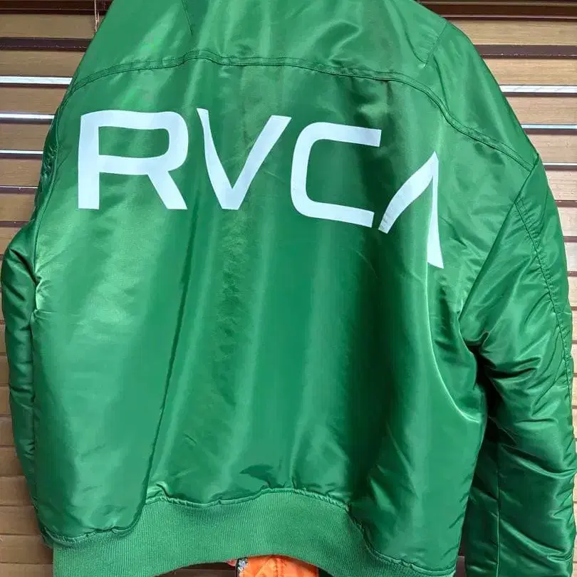 그린 색상의 리버서블 자켓, 오렌지 색상 안감, RVCA 로고 포함. - 브랜드: RVCA - 색상: 그린 - 안감 색상: 오렌지 - 디자인: 봄버 자켓 스타일 - 로고: 큰 RVCA 로고 방문해 주셔서 감사합니다. 사이즈 - L