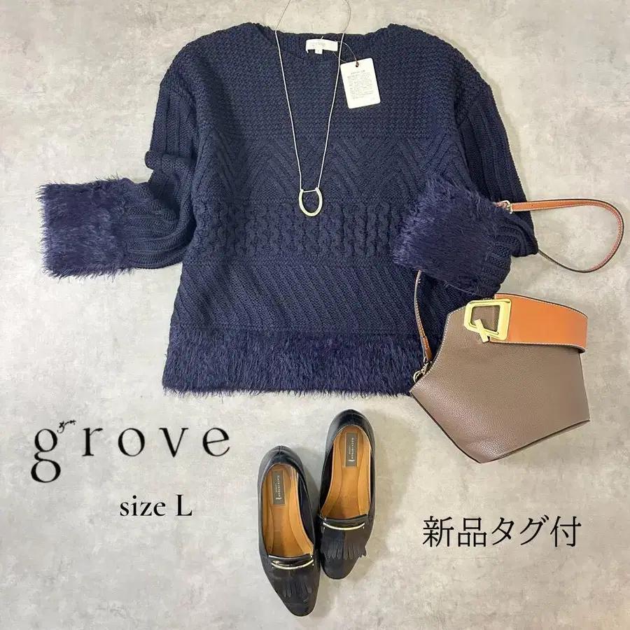 [택 포함 새상품] grove 디자인 편직 니트 L 네이비 프린지 조절