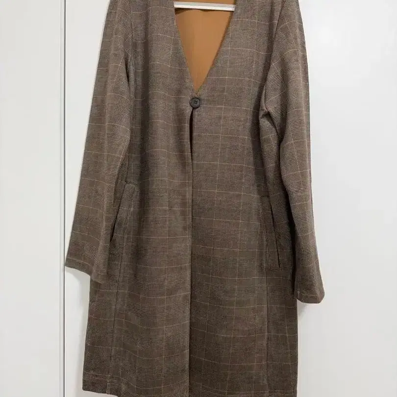 체크 무늬 V넥 롱 코트, 버튼 포함 기장 약 85cm - 색상: 브라운 계열의 체크 무늬 - 버튼 유무: 버튼 포함 - 스타일: 롱 코트 - 디자인: V넥 디자인 - 포켓: 있음 실내에서 시착 정도만 사용했습니다. 얇은 소재라 가을 시즌에 추천합니다.