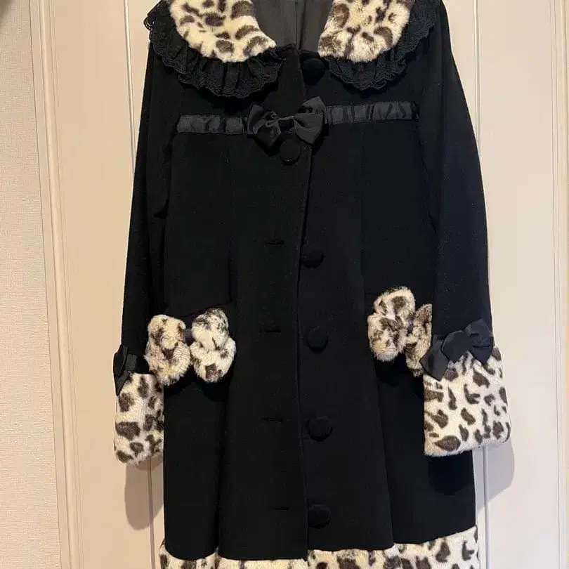 자동 번역되었어요. 원문보기프릴 옷깃과 레오파드 무늬 장식이 있는 귀여운 롱 코트.