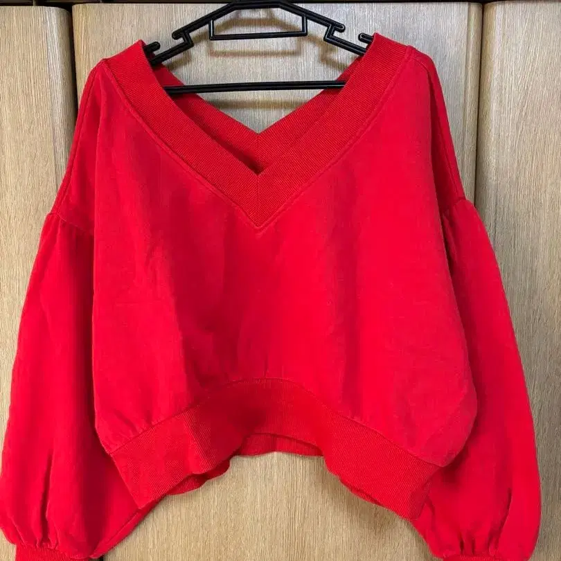 V넥과 벌룬 슬리브 디자인이 특징인 빨간색 크롭 스웨터.