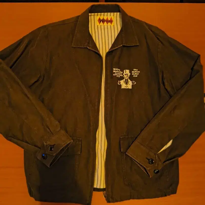 그레이 (블랙에 가까운) 자켓, 안쪽은 스트라이프, 뒷면에 유니크한 프린트. 구매 시부터 유즈드 느낌의 마감입니다. 사용감이 있지만, 큰 흠집이나 구멍, 얼룩 등은 없습니다. - 색상: 올리브 - 디자인: 안쪽 스트라이프, 뒷면 프린트 - 특징: 프론트 자수, 버튼 달린 소매 - 텍스트: THE WEIRDO OH 방문해 주셔서 감사합니다.