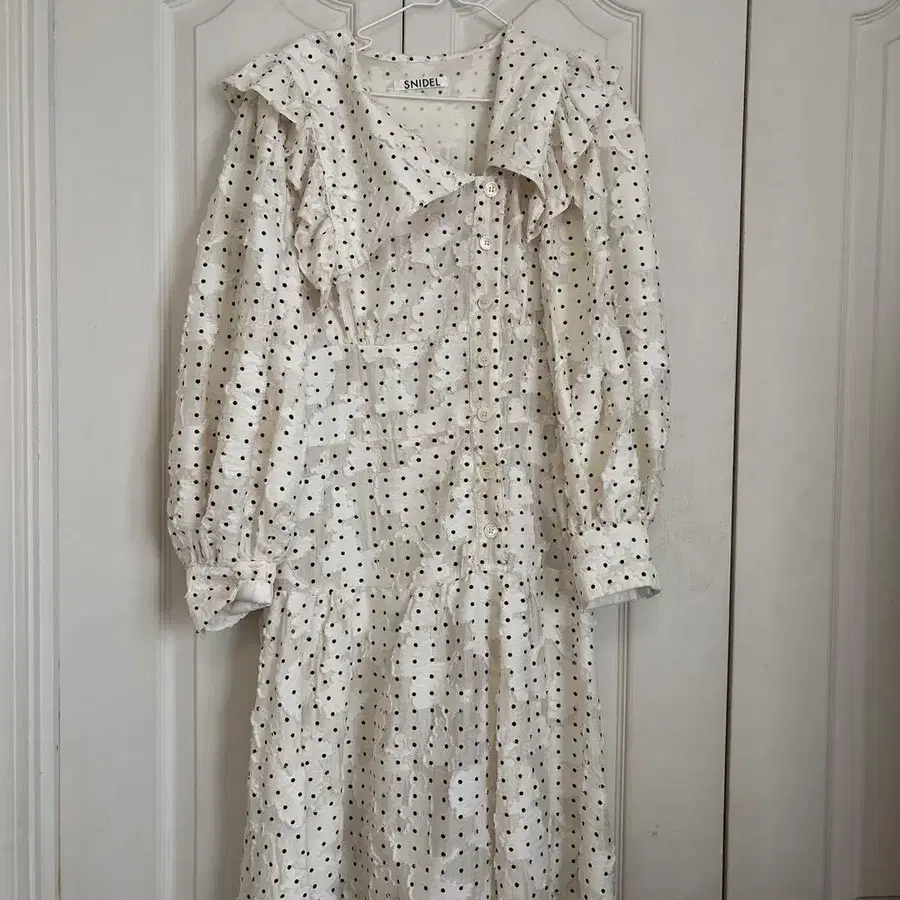 화이트 색상의 도트 무늬, 프릴이 달린 긴팔 원피스. 이너는 포함되지 않습니다. - 브랜드: SNIDEL - 디자인: 도트 무늬 - 색상: 화이트 - 소매 스타일: 긴팔 - 특징: 프릴 포함 방문해 주셔서 감사합니다. 사이즈 - S