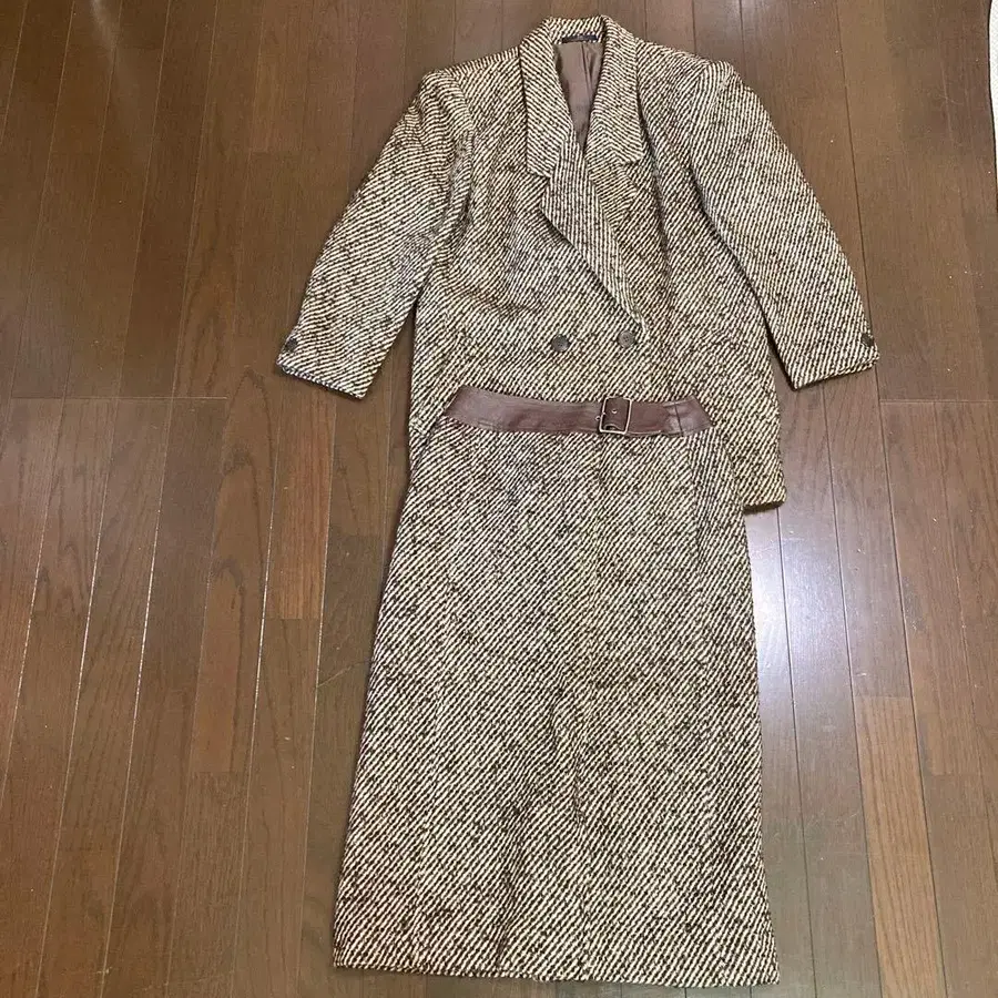 J&R에서 오래전에 구매하여 거의 착용하지 않고 자택 보관했습니다. 사이즈 - M 빅 사이즈 모 85% 셋업 스커트 허리 벨트 부분이 약간 뻣뻣하지만, 갈라짐 등은 없습니다. 자켓은 더블 어깨 패드 있음, 탈부착 불가 사이즈 표기 M 자켓 기장 약 76cm 가슴 너비 약 52cm 소매 길이 약 53cm 스커트 기장 약 73cm 허리 약 64cm 질문 등 편하게 해주세요!
