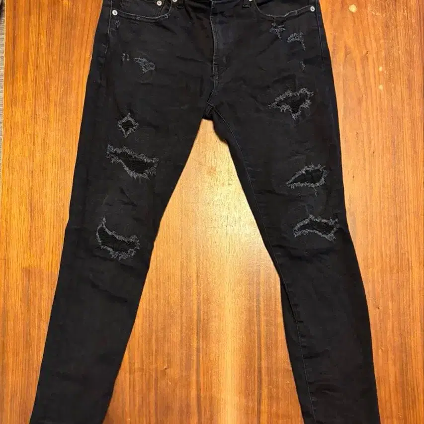데미지 가공이 들어간 스키니 데님, 블랙 컬러, 사이즈 M.