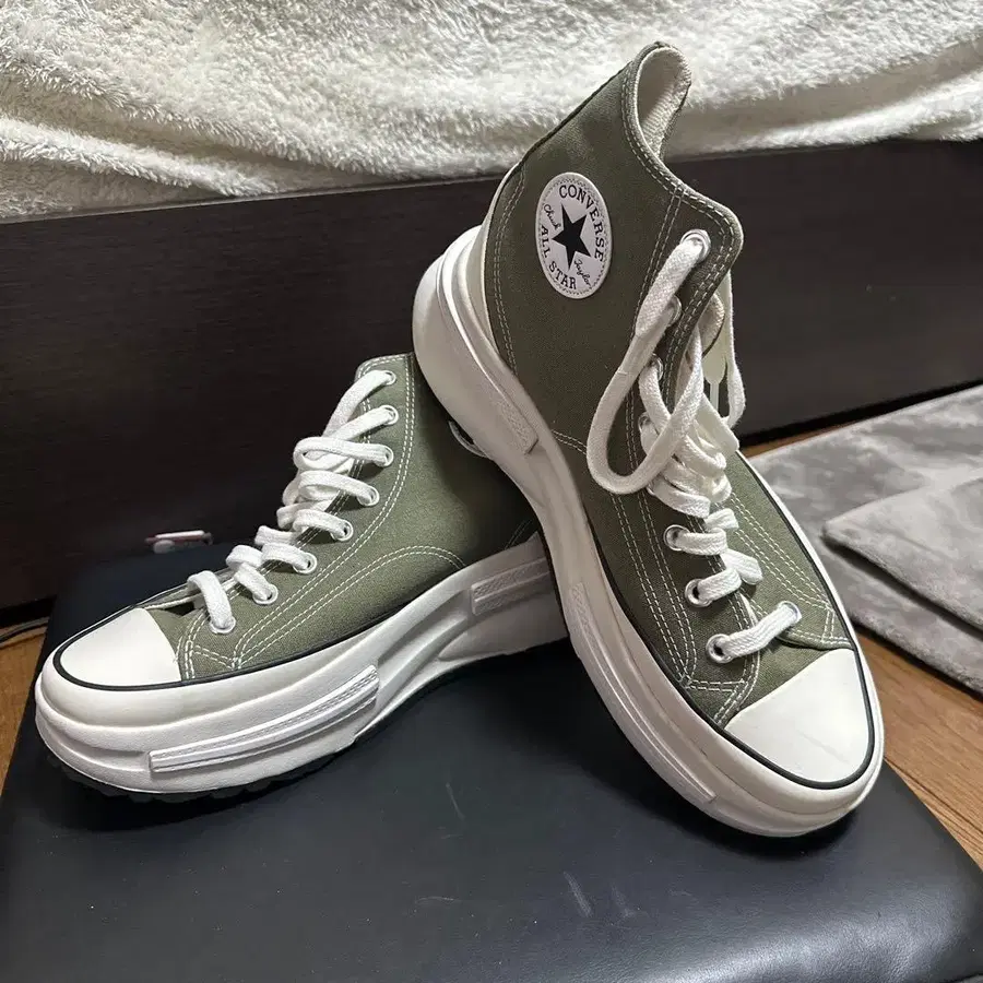 미사용이지만 발가락 부분에 마찰 있음. 올리브 색상의 캔버스 소재 스니커즈, CONVERSE의 ALL STAR. - 브랜드: CONVERSE - 모델: ALL STAR - 색상: 올리브 - 소재: 캔버스 - 밑창: 러버 방문해 주셔서 감사합니다.