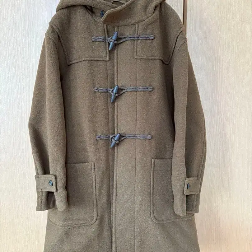 유니클로 올리브 브라운 더플 코트, 후드 부착 디자인으로 스타일리시합니다.