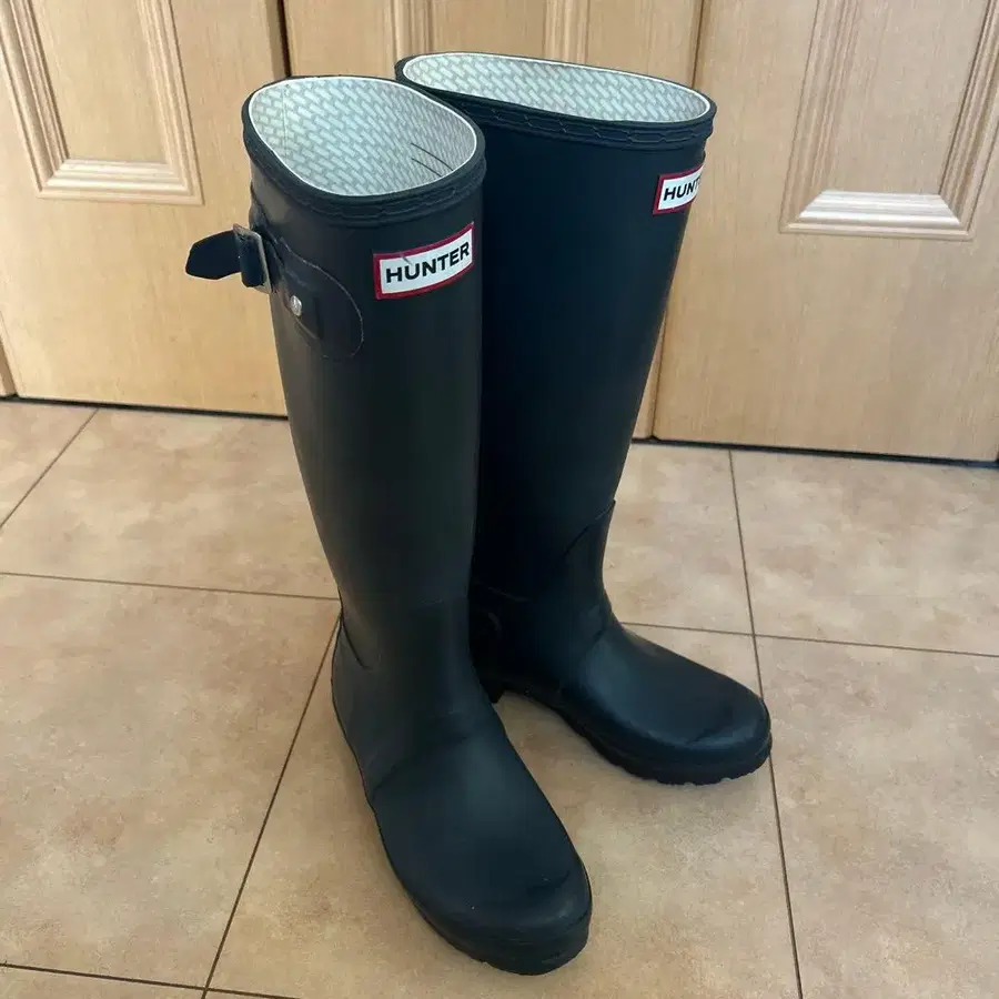 내구성 있는 러버 소재의 블랙 장화, 버클 포함. - 브랜드: HUNTER - 색상: 블랙 - 스타일: 장화 - 특징: 버클 포함 - 밑창: 러버 솔 방문해 주셔서 감사합니다. 사이즈 - 22cm