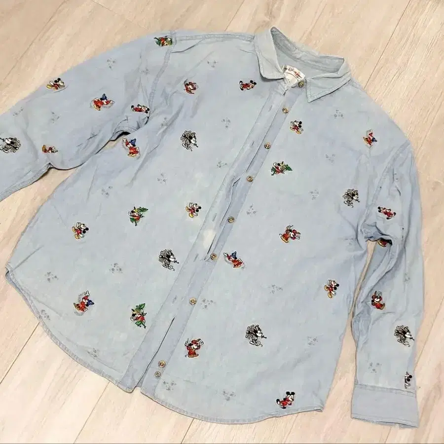 미키 자수가 들어간 바지 셔츠입니다. 올드 팬들이 좋아할 만한 미키의 다양한 스타일이 담겨 있습니다. 색이 바랜 듯한 부분이 있었습니다. 마지막 사진을 확인해 주세요.