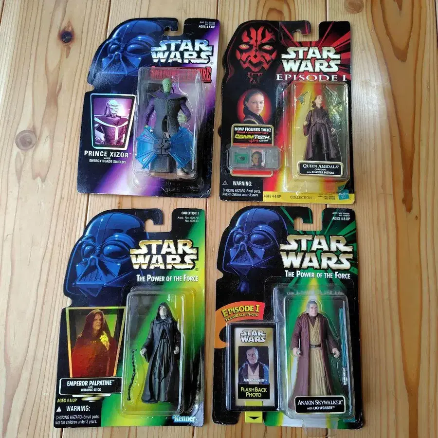 장기 보관 1996~98년 대지, 케이스 얼룩 있음 Star Wars 피규어 4세트 CommTech 칩이 포함된 Queen Amidala 포함 - 캐릭터명: Prince Xizor - 캐릭터명: Emperor Palpatine - 캐릭터명: Anakin Skywalker - 캐릭터명: Queen Amidala - 기능: CommTech 칩 포함