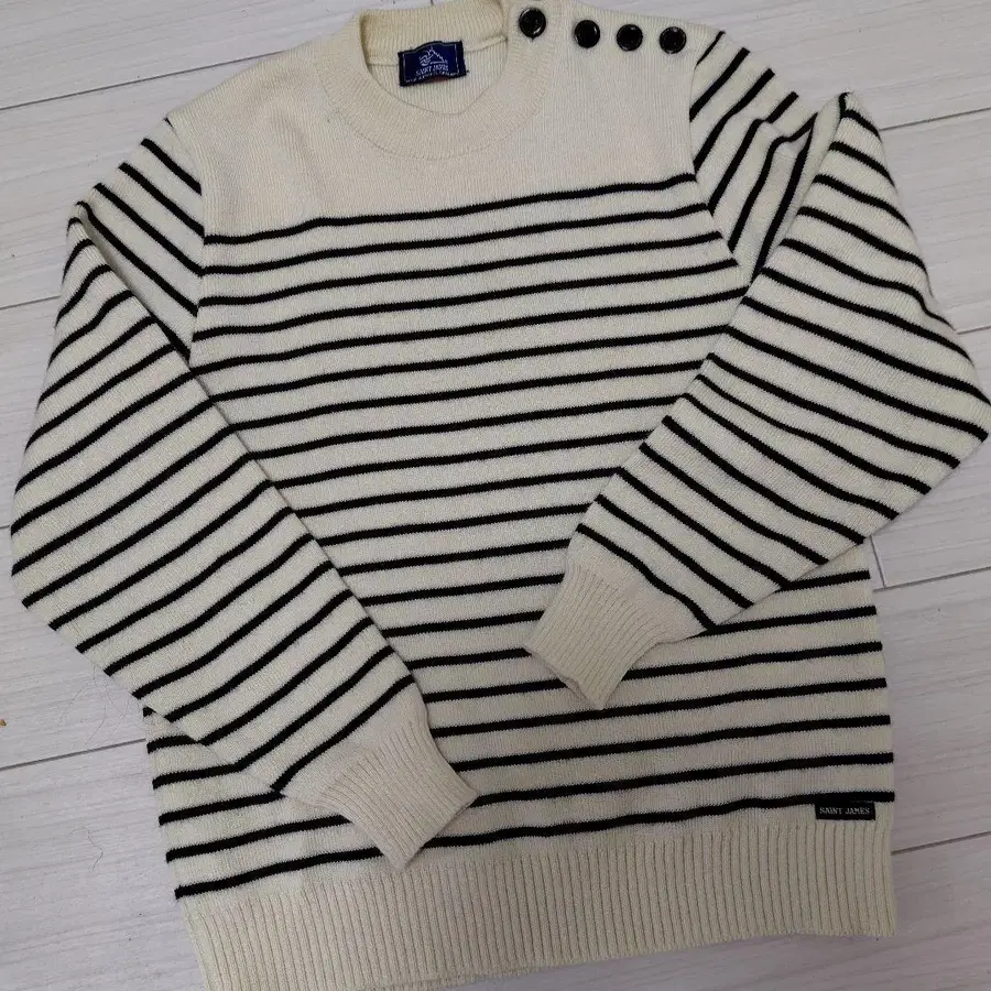세인트 제임스 스웨터입니다. 사용 횟수는 3회 정도입니다. 앞쪽 밑단에 작은 얼룩이 있습니다. - 브랜드: SAINT JAMES - 색상: 아이보리/블랙 - 디자인: 스트라이프 - 스타일: 크루넥 - 특징: 버튼 포함 방문해 주셔서 감사합니다.