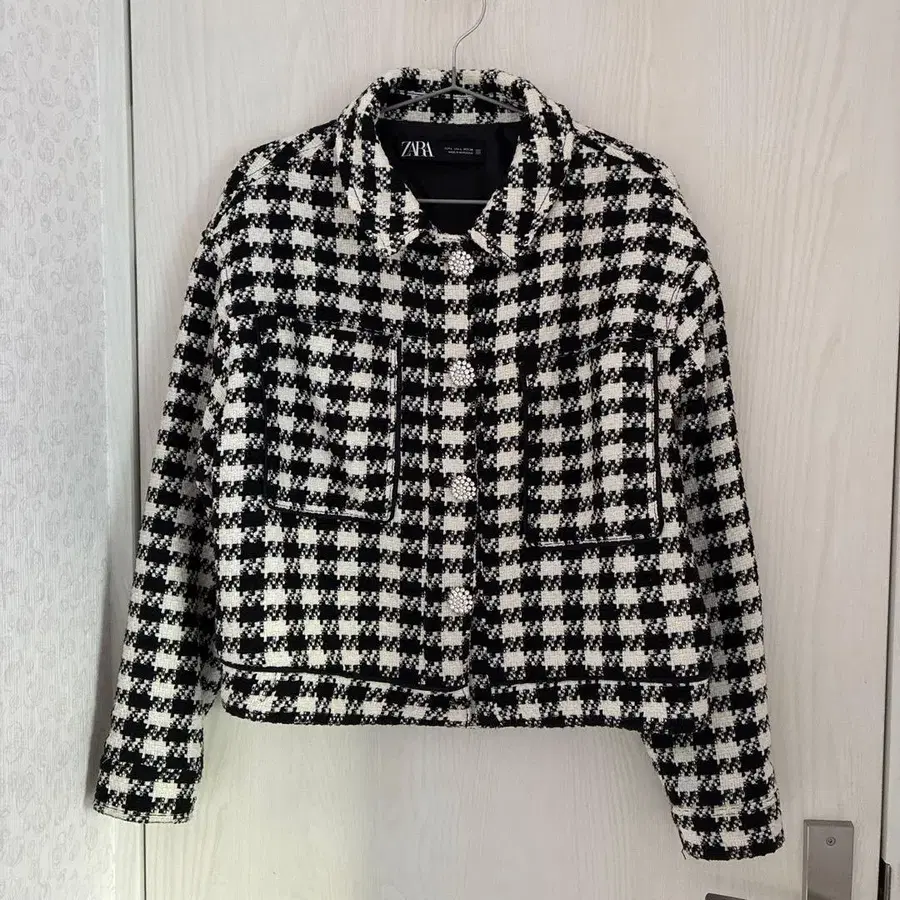 트위드 소재의 블랙 화이트 체크 무늬 테일러드 자켓.