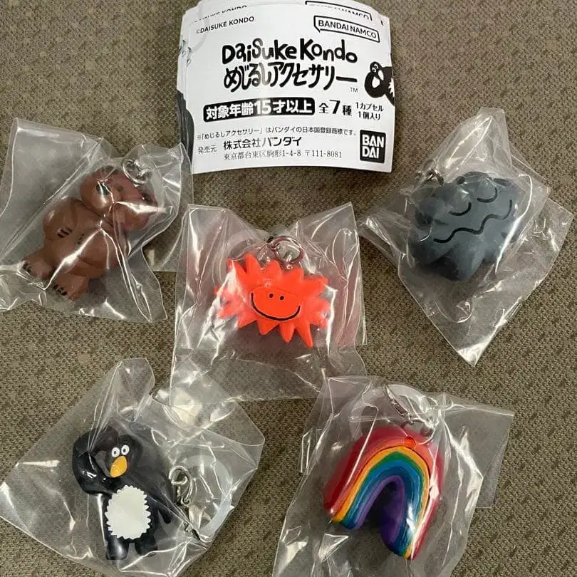 Daisuke Kondo 메지루시 액세서리 kumo, dokodemoniji, taiyo kuma, pengin 5개 세트입니다. 리플렛 포함. 낱개 판매는 불가합니다. 익명 배송 즉시 구매 가능합니다. 잘 부탁드립니다. 타이틀 - 메지루시 액세서리 카테고리 - 가챠가챠