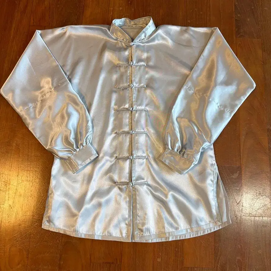 새틴 소재의 실버 차이나 셔츠, 엘레강트한 디자인.