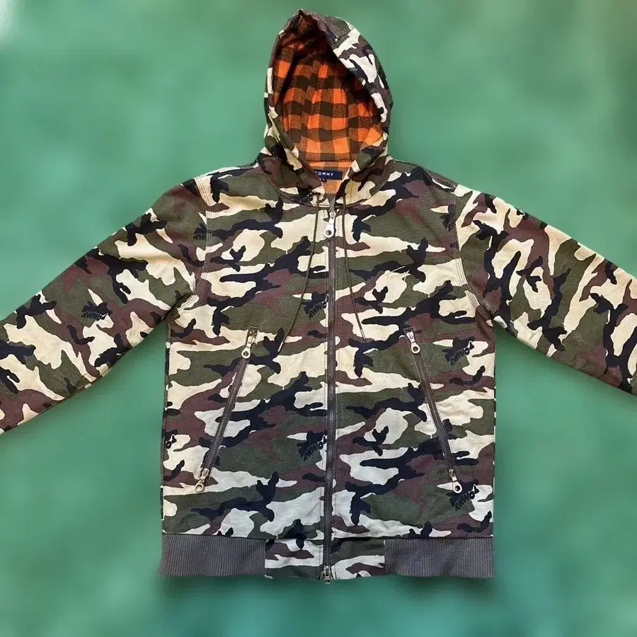 카모 패턴 TOMMY 후드티, L 사이즈, 오렌지 체크 무늬 안감 부착.