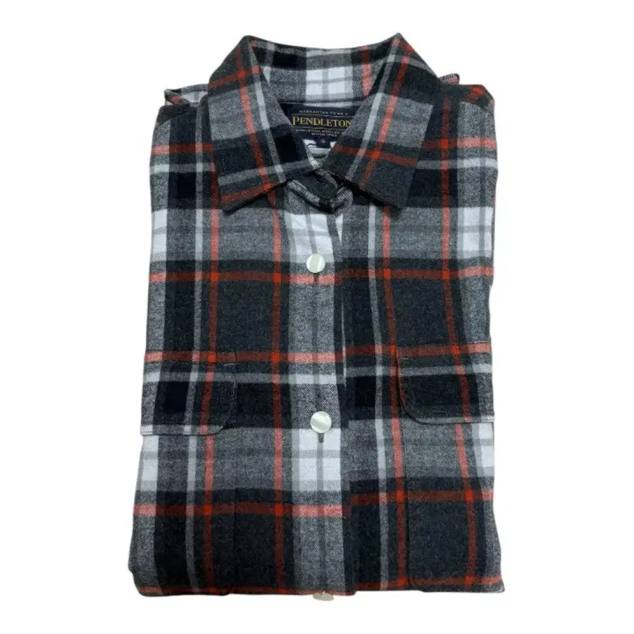 울 혼방의 그레이와 오렌지 체크 무늬 셔츠, 스타일리시하고 따뜻함이 있습니다.