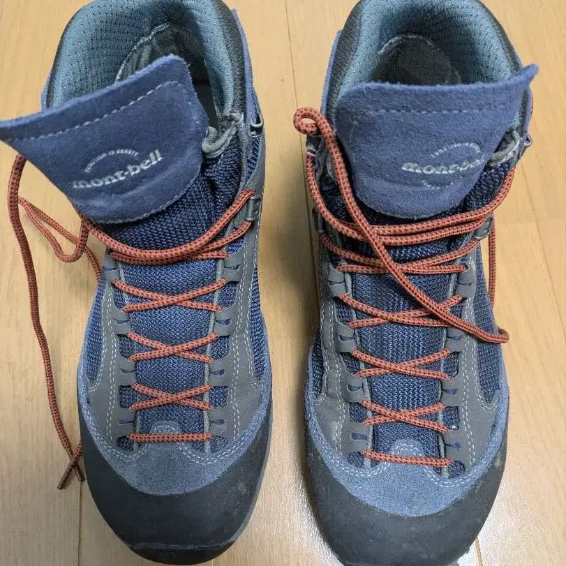 Montbell 제조 방수 트레킹 슈즈, 그레이와 블루의 배색으로 아웃도어에 최적.