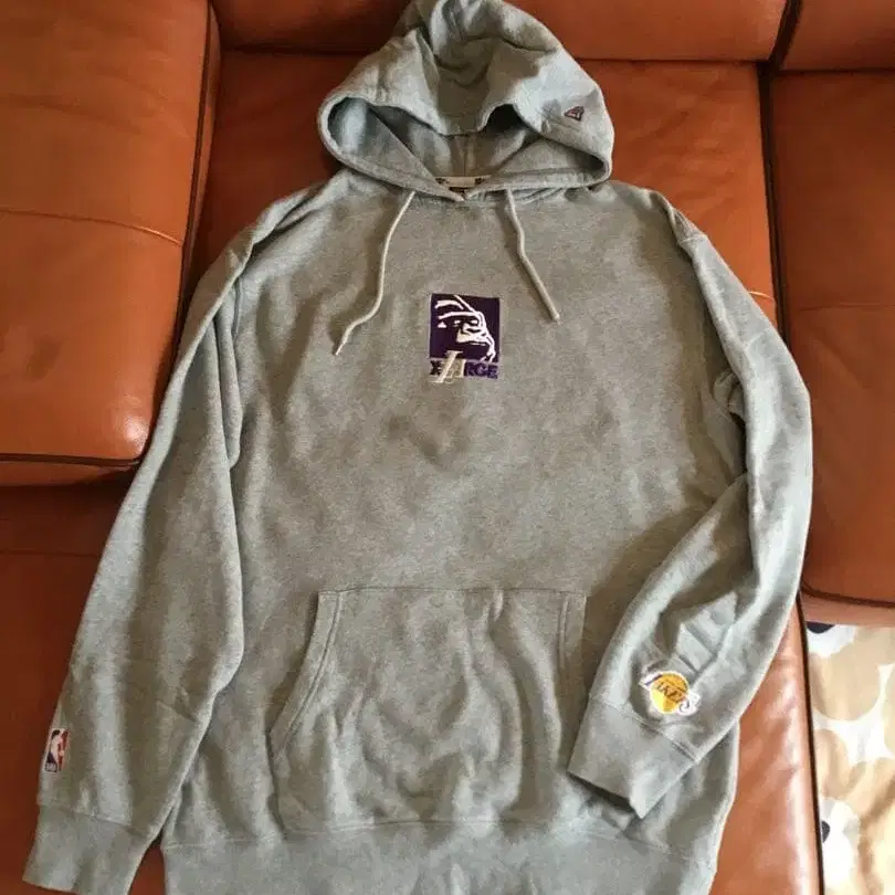 그레이 색상의 후드티, 로스앤젤레스 레이커스 로고 부착.
