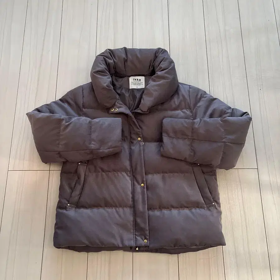 그레이 색상의 ikka 브랜드 다운 자켓, L 사이즈, 버튼과 포켓이 있습니다.