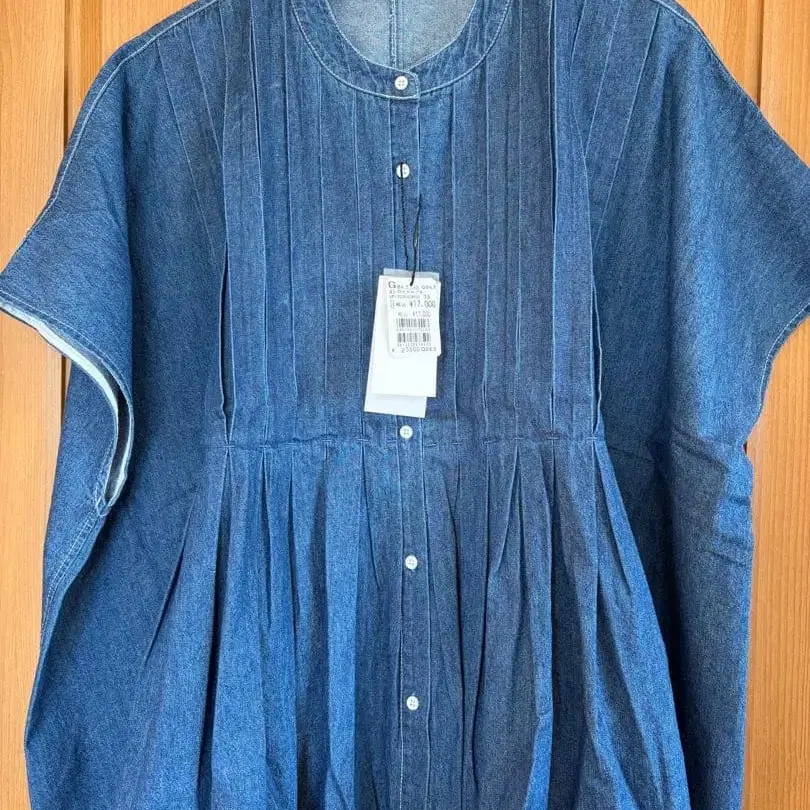 45R 인디고 자수 플리츠 블라우스 데님 셔츠