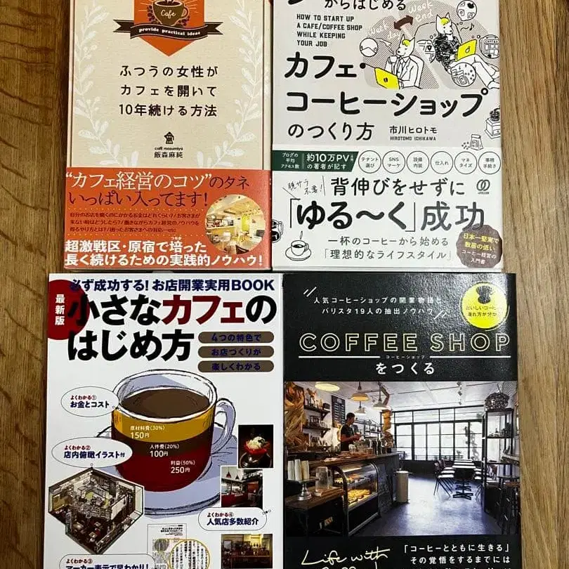 카페나 커피샵 개업에 도움이 되는 실용적인 가이드북 4권 세트. - 타이틀: 더블 워크 카페 커피샵 만들기 - 타이틀: 작은 카페 시작하기 - 타이틀: COFFEE SHOP - 타이틀: 마케팅부터 돈 이야기까지 한 번 읽었을 뿐이지만 일부 스크래치나 미세한 찢김 등이 있습니다. 개업을 목적으로 구매했지만 목표를 달성하여 양도합니다. 전반적으로 특별히 신경 쓰이지 않지만 예민하신 분의 구매는 삼가해 주시기 바랍니다.