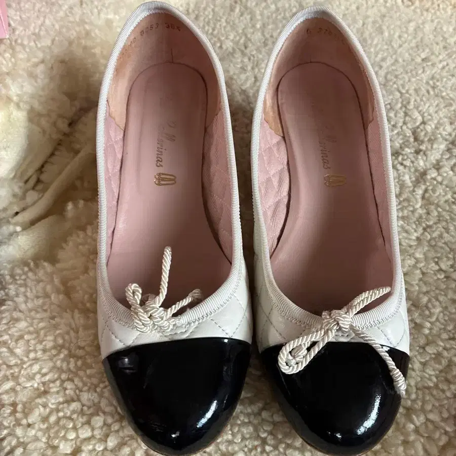 퀼팅 디자인의 화이트와 블랙 발레리나 신발, 리본 포함. - 색상: 화이트/블랙 - 디자인: 퀼팅 디자인 - 장식: 리본 포함 - 굽 높이: 4cm - 사이즈 36.5 방문해 주셔서 감사합니다.