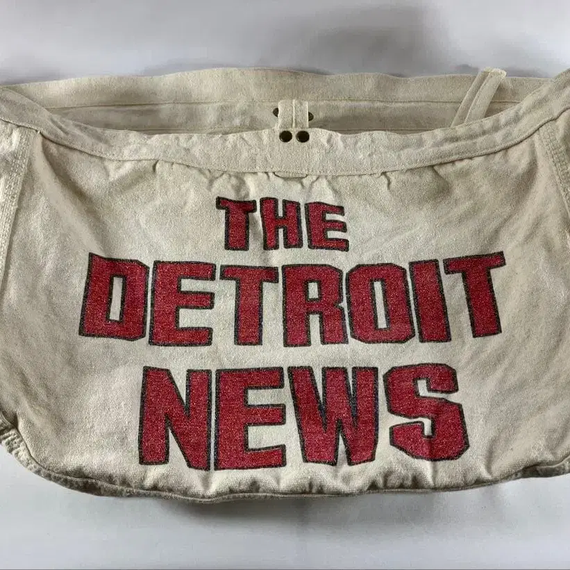 아이보리 색상의 코튼 소재 메신저 백으로, THE DETROIT NEWS 프린트 로고가 있습니다.