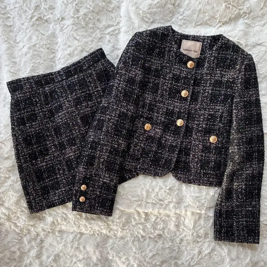 ♡ 방문해 주셔서 감사합니다 ♡ 트위드 소재에 골드 버튼이 악센트인 자켓과 스커트 셋업입니다. - 컬러: 블랙 계열 - 소재: 트위드 - 스타일: 자켓과 스커트 세트 해당 상품은 한 번 짧게 착용했습니다. 눈에 띄는 데미지는 없습니다. 아직 깨끗하게 사용하실 수 있는 상품이지만 used 상품이므로 이해하신 후 구매 잘 부탁드립니다 ◡ ̈ ♥︎
