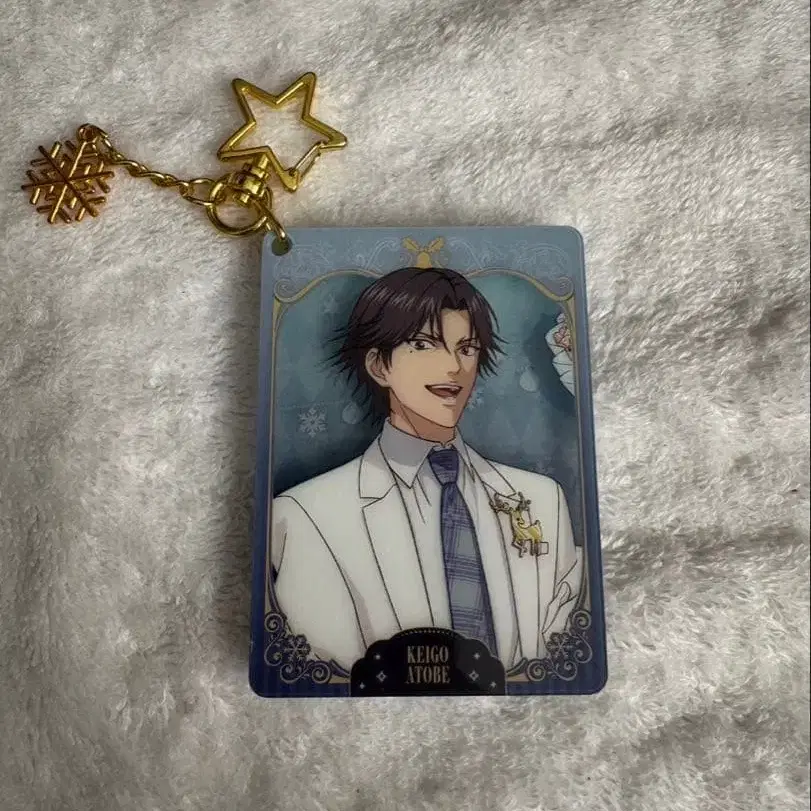 화이트 수트를 입은 아토베 케이고 아크릴 키링, 별 모양 스트랩 포함.