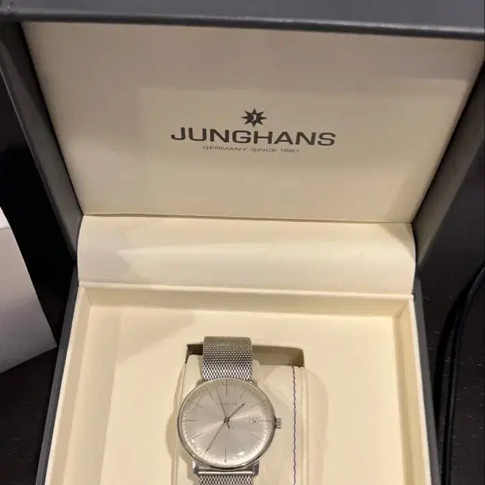 실버 메쉬 밴드와 날짜 표시 기능을 갖춘 클래식한 디자인의 시계입니다. 상판에 흠집이 있습니다. - 브랜드: JUNGHANS - 색상: 실버 - 소재: 메쉬 밴드 - 특징: 날짜 표시 기능 - 스타일: 클래식 방문해 주셔서 감사합니다.