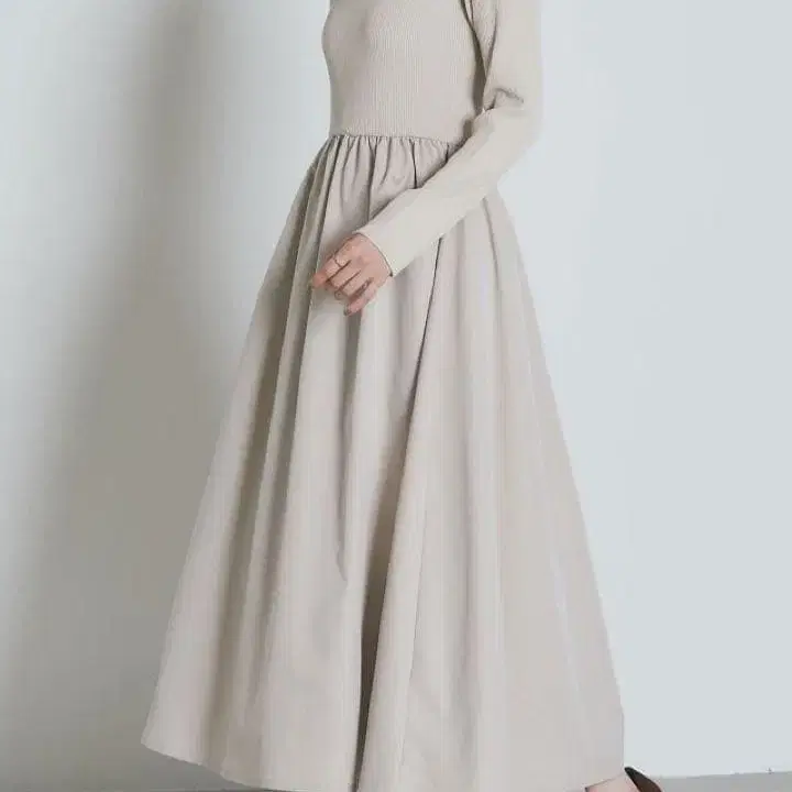 stylemixer 니트 롱 원피스 플레어 슬리브 리브 베이지