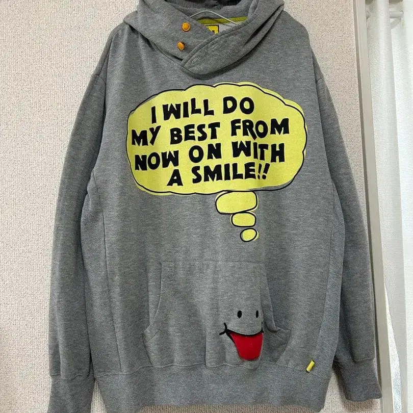 유니크한 웃는 얼굴 디자인의 그레이 후드티.