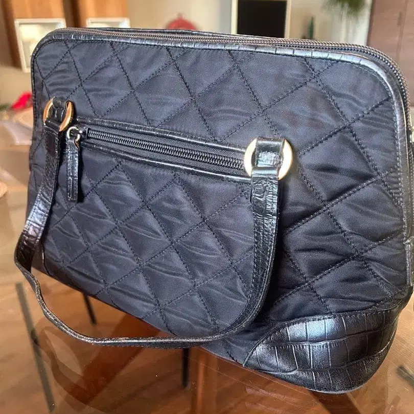 퀼팅 디자인의 블랙 나일론 백, 금장 장식이 달린 지퍼가 특징. - 색상: 블랙 - 디자인: 퀼팅 - 소재: 나일론 - 스트랩 종류: 핸들 포함 - 디테일: 금장 장식이 달린 지퍼 - 디테일: 금장 장식이 달린 지퍼 방문해 주셔서 감사합니다.