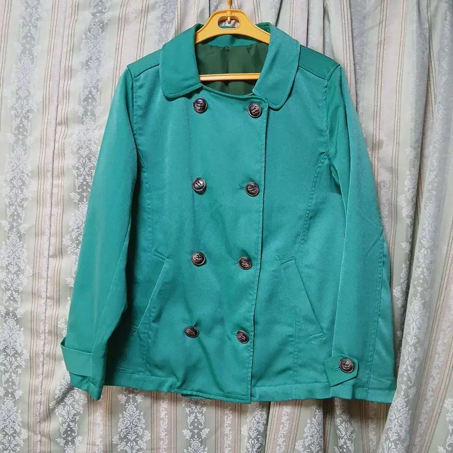 더블 브레스트 디자인의 그린 컬러 자켓, 사이드 포켓과 버튼이 달린 소매가 특징입니다. 사진보다 짙은 그린 컬러입니다. - 색상: 그린 - 디자인: 더블 브레스트 - 포켓: 사이드 포켓 있음.
