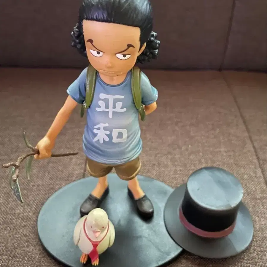 원피스 캐릭터, 평화 문자가 새겨진 티셔츠를 입은 피규어, 모자와 새 피규어 포함.