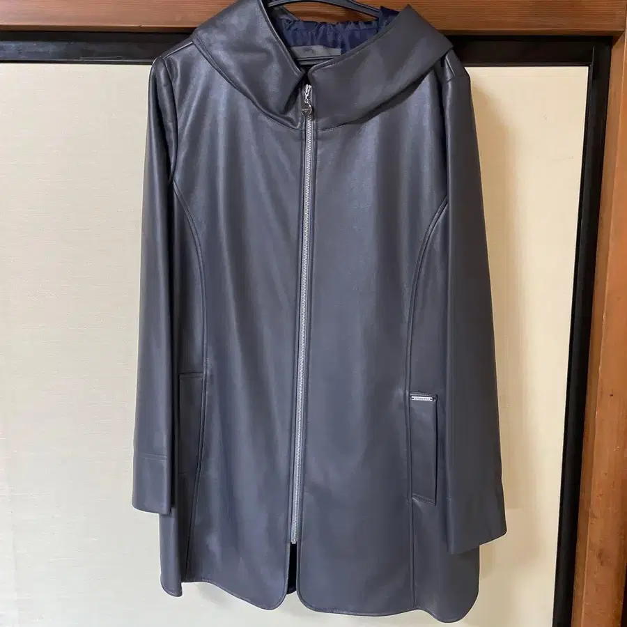 후드 부착된 심플한 그레이 색상의 가죽 자켓입니다.