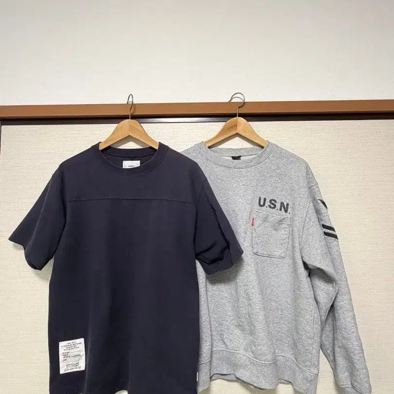 방문해 주셔서 감사합니다. 오랫동안 착용했지만, 여기서 처분하고자 판매하게 되었습니다. U.S.N. 로고가 특징적인 코튼 혼방 트레이닝복과 네이비 상의 세트. - 색상: 네이비 - 색상: 그레이 - 디자인: U.S.N. 로고 부착 - 소재: 코튼 혼방 - 특징: 포켓 부착 얼룩, 찢김, 냄새 등 - 없음