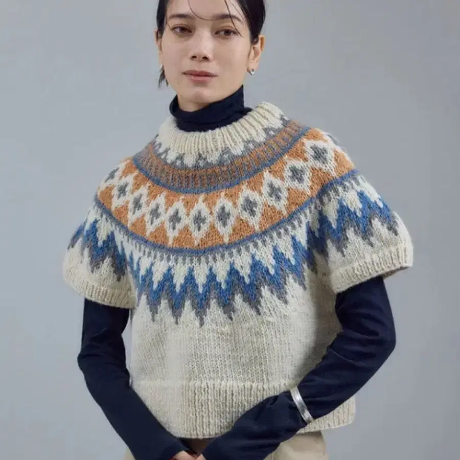 대담한 기하학 패턴이 인상적인 페어아일 패턴의 하프 슬리브 핸드 니트.