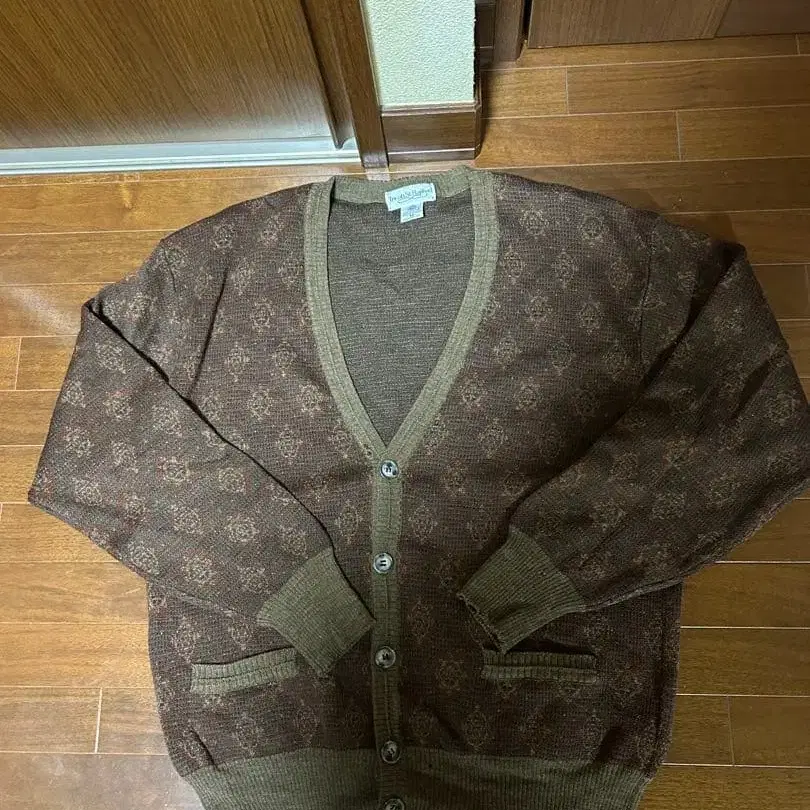 브라운 계열의 울 가디건, M 사이즈, 앞면에 포켓 부착.