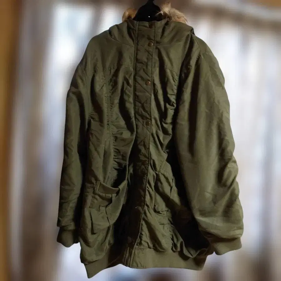 올리브 그린 퍼 후드 모즈 코트, 안쪽 보아 소재로 따뜻함을 제공합니다.