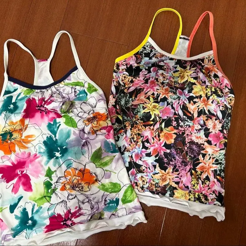 컬러풀한 꽃무늬 디자인의 탱크탑 2장 세트, 스트레치 소재로 쾌적한 착용감. 전신 기장 41, 총 기장 56, 가슴 너비 36, 밑단 폭 38 - 디자인: 꽃무늬 - 색상: 멀티 컬러 - 스타일: 탱크탑 - 소재: 스트레치 소재 - 특징: 슬림 핏 - 넥라인: 라운드넥 방문해 주셔서 감사합니다. 사이즈 - M