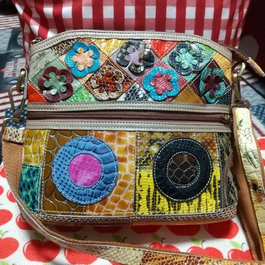 컬러풀한 패치워크 디자인의 숄더백, 조정 가능한 스트랩 포함. - 디자인: 패치워크 스타일, 컬러풀한 꽃 장식 - 소재: 합성 피혁, 광택 있는 마감 - 색상: 멀티, 파랑, 오렌지, 그린, 블랙, 핑크 - 포켓: 외부에 지퍼 포켓 있음 - 스트랩: 조정 가능한 숄더 스트랩 사이즈 가로 약 27cm 세로 약 23cm 바닥 약 9cm x 약 25cm 방문해 주셔서 감사합니다.