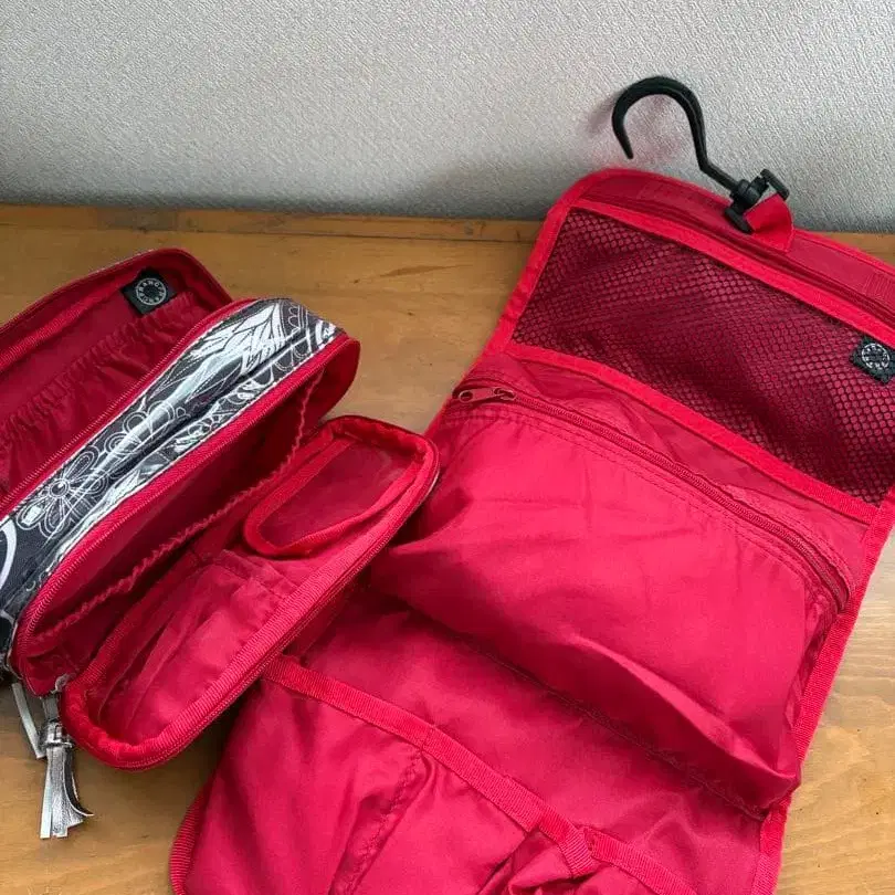 걸 수 있는 빨간색 꽃무늬 여행용 수납 백, 파우치. 포켓이 많아 수납이 편리합니다. 호텔에서도 그대로 걸어서 사용할 수 있어 편리합니다. 자주 여행, 출장을 가시는 분들께! 세련되고 귀엽습니다. - 색상: 빨간색과 블랙 - 디자인: 꽃무늬 - 기능: 후크 포함으로 걸 수 있음 - 포켓 수: 여러 개의 수납 포켓 메이크업용 파우치 - 소재: 방수 소재 ※ 메이크업 파우치의 태슬이 일부 끊어져 없어졌습니다. 사진이 현물입니다. 3회 사용하였으므로 상태가 좋습니다. 중고에 신경 쓰이지 않는 분께 ^ ^