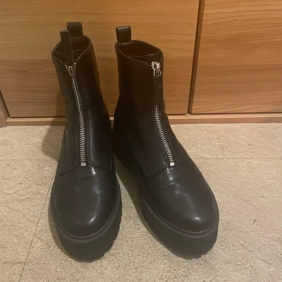 지퍼가 달린 블랙 통굽 사이드 고어 부츠. - 색상: 블랙 - 디자인: 지퍼 포함 - 밑창 높이: 통굽 - 스타일: 사이드 고어 - 백 스타일: 심플한 디자인 방문해 주셔서 감사합니다. 2회 정도 착용했습니다. 밑창 마모도 없습니다. 사이즈 - 22.5cm S 사이즈 힐 높이 4.5cm 컬러 - 블랙 계열 소재 - 인조 가죽 얼룩, 찢김, 냄새 등 - 없음