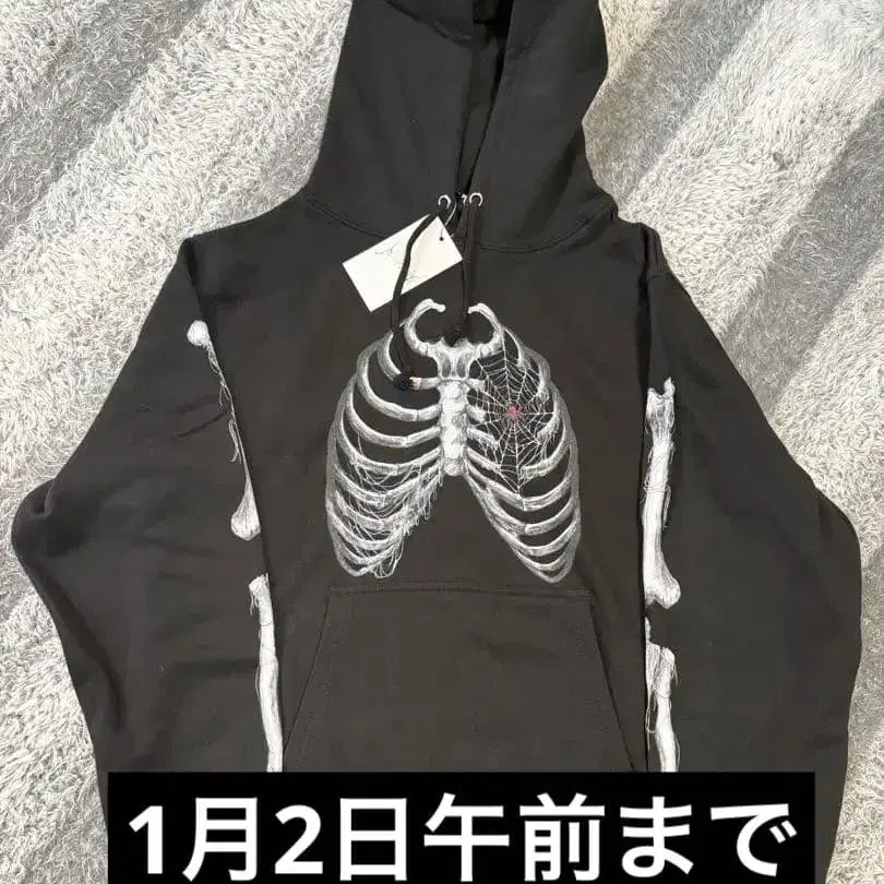 골격 디자인의 블랙 후드티, 사이즈 S, 택 포함.
