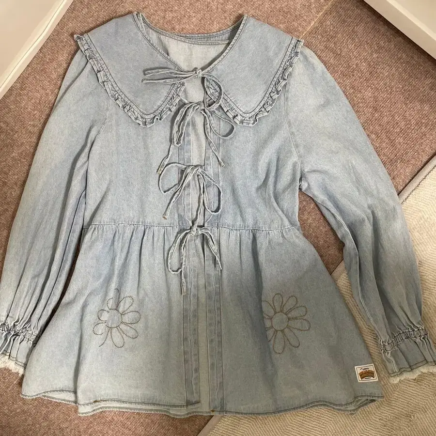 플라워 자수와 리본이 달린 데님 셔츠, 라이트 블루.