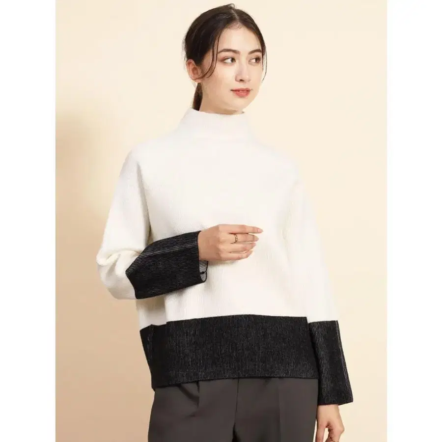 소매와 밑단의 화이트와 블랙 바이컬러가 포인트인 풀오버 니트. 목 부분의 하이넥 디자인이 방한을 하면서도 얼굴 주변을 깔끔하게 보이게 해줍니다. 힙을 가리는 기장감으로 여유로운 실루엣이라 신경 쓰이는 부분도 확실하게 커버. 래글런 절개가 되어 있어 몸에 잘 맞아 쾌적한 착용감을 실현했습니다. 인상적인 디자인이라 단품으로 입는 것은 물론, 배색 디자인이 코트 안에서도 돋보이는 아이템입니다. 볼륨 스커트와의 페미닌한 코디나 데님 팬츠와의 캐주얼한 코디도 추천합니다. - 소재: 니트 - 소매 길이: 긴팔 방문해 주셔서 감사합니다.