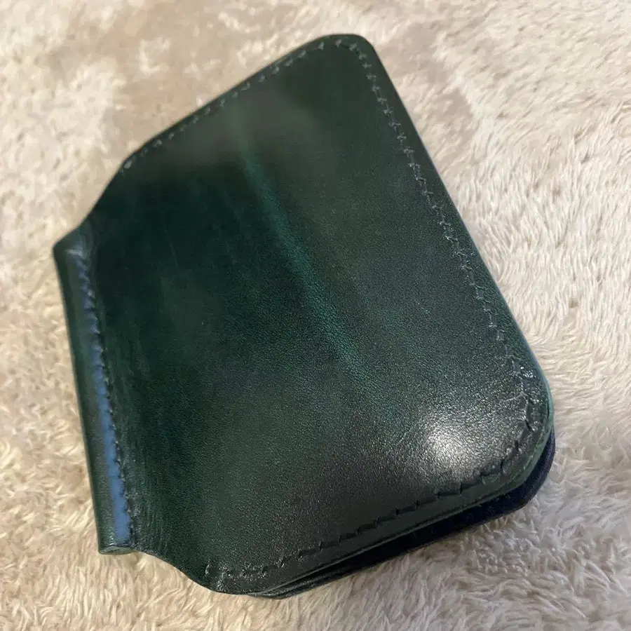 자동 번역되었어요. 원문보기다크 그린 색상의 가죽 머니클립, 카드와 코인 수납 가능.