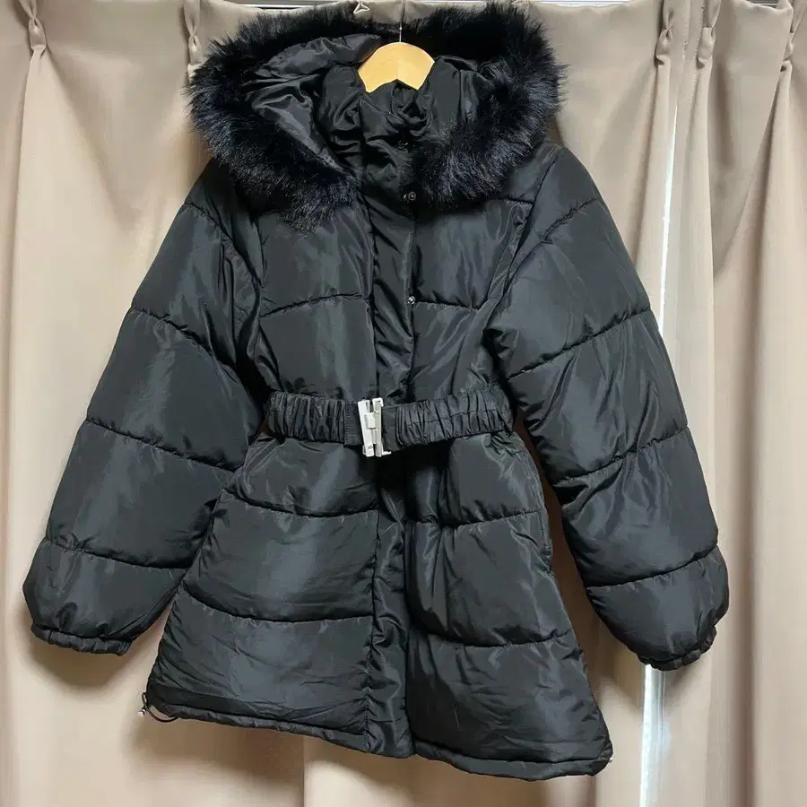 자동 번역되었어요. 원문보기후드 부착 블랙 다운 자켓, 허리밴딩으로 실루엣 조정 가능.