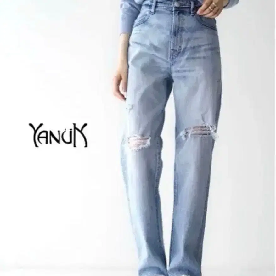 YANUK의 라이트 블루 스트레이트 데님, 데미지 가공 있음.